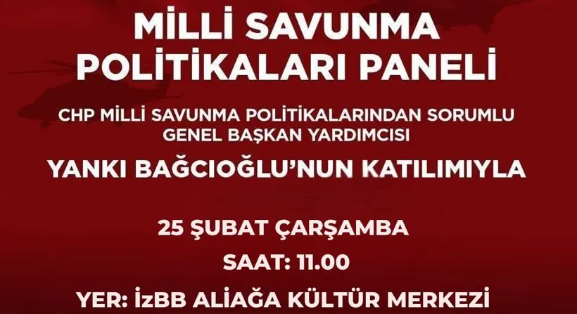 Cumhuriyet Halk Partisi Aliağa İlçe Başkanlığı tarafından düzenlenen “Milli Savunma Politikaları Paneli”, 25 Şubat Çarşamba günü Aliağa’da yapılacak. Panelde Türkiye’nin savunma politikaları ve stratejik vizyonu çok boyutlu şekilde değerlendirilecek.