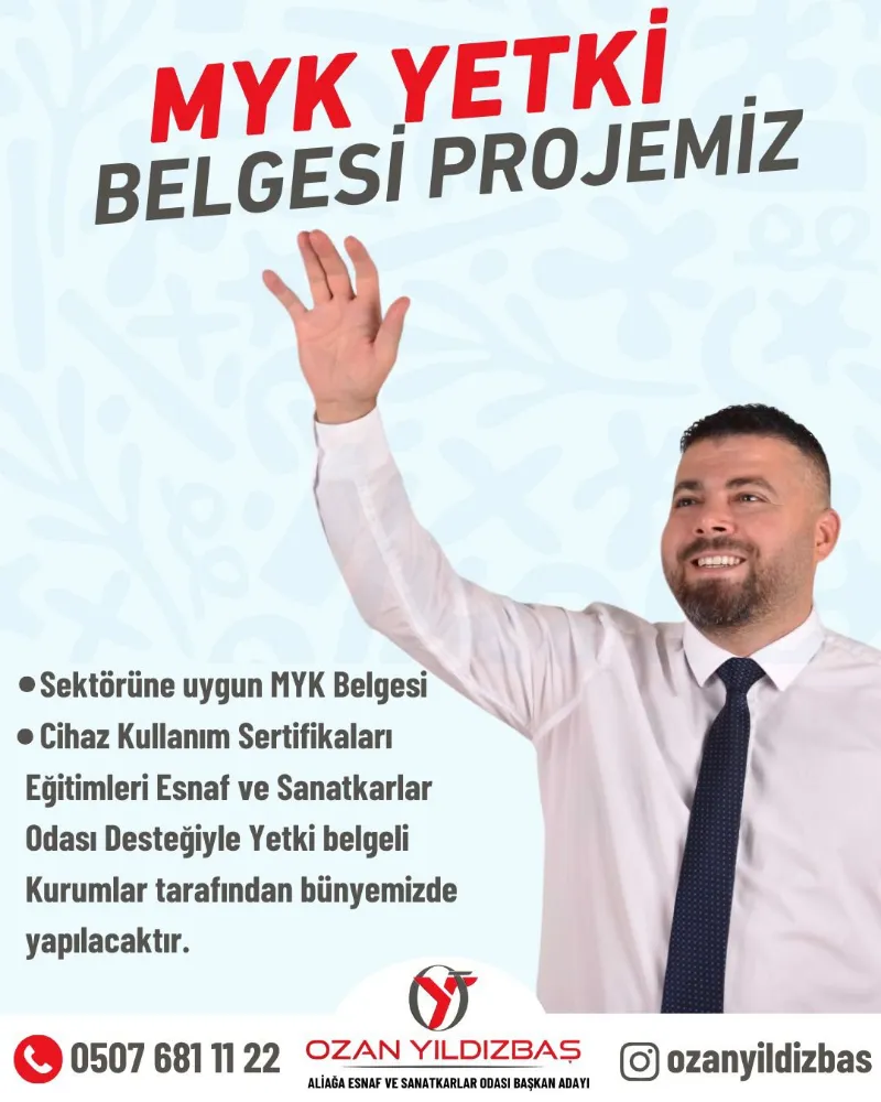 Aliağa Esnaf ve Sanatkârlar Odası seçimlerinde aday olan Ozan Yıldızbaş, MYK (Mesleki Yeterlilik) Belgesi Projesi ile “Mutlu Esnaf Projesi”ne ilişkin açıklamalarda bulundu. Yıldızbaş, projelerin esnafın mesleki yeterliliğini artırmayı, hizmet kalitesini yükseltmeyi ve yerel ekonomiyi güçlendirmeyi hedeflediğini söyledi.